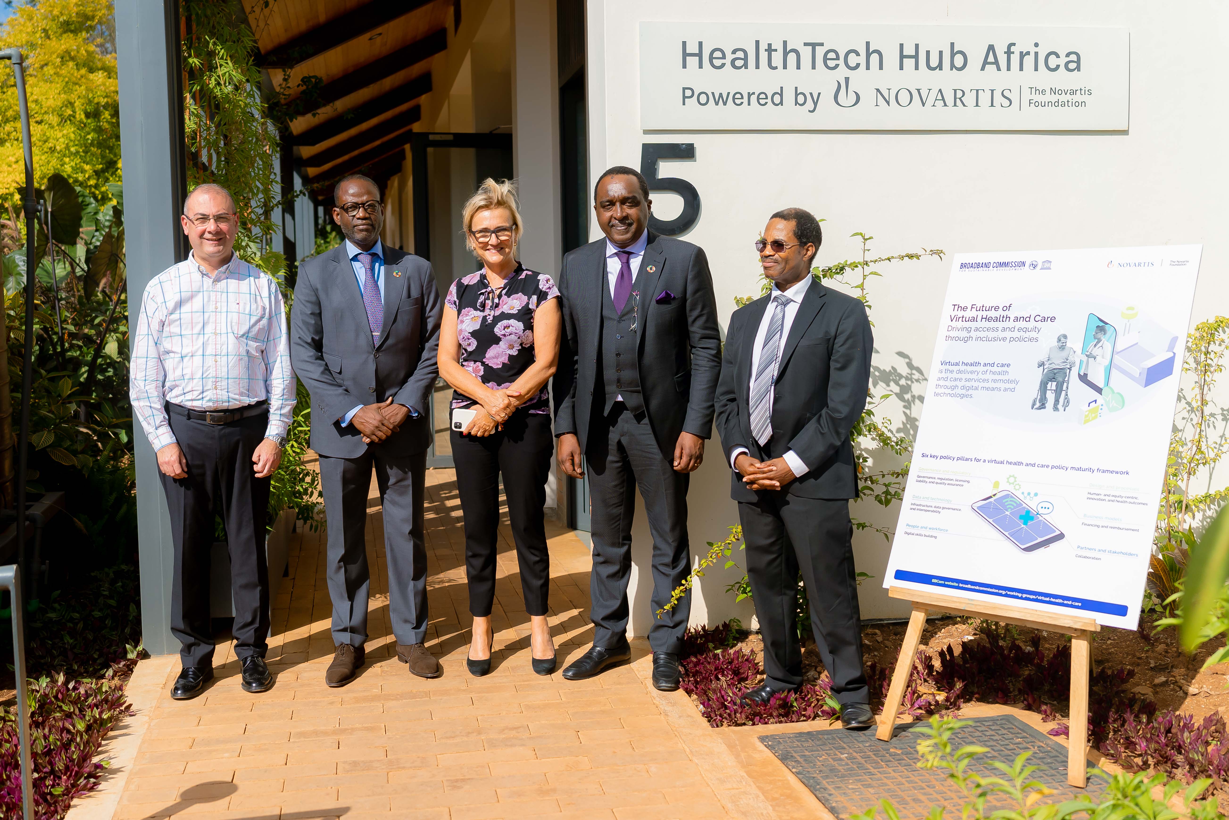 - (L-R) Mr. Hani Eskandar, Senior Coordinator - Digital Services at the International Telecommunication Union, Mr. Lacina Koné, CEO, Smart Africa, Dr. Ann Aerts, Head, Novartis Foundation, Mr. Bocar Ba, CEO, Samena Telecommunications Council, Dr. Brian Chirombo, Representative of the WHO to the Republic of Rwanda during the launch of the report from the Broadband Commission Working Group on Virtual Health and Care, co-chaired by the World Health Organization and the Novartis Foundation on June 4, 2022 at Norrsken House Kigali, Rwanda